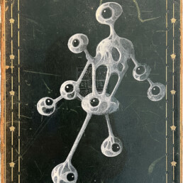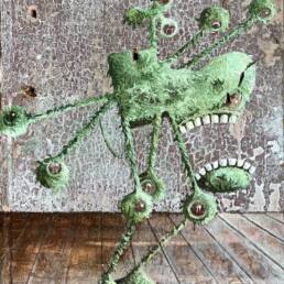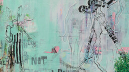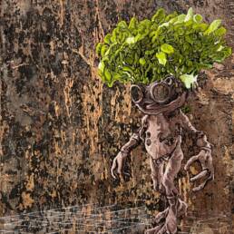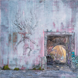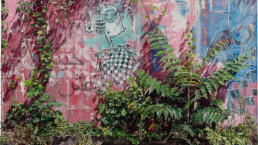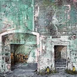 “Miranda Donovan’s multi-layered works reflect the rawness and vulnerability of the contemporary human condition. At once beautiful and abject, her ‘sculptural paintings’ feature street art; uncanny, alien characters; and the discarded oddities of man’s thoughtless way of life, amid leafy trees and resilient urban undergrowth. There is disorder and decay; crumbling bricks built up as a palimpsest of pencil marks, paint and sgraffito; and yet undeniable signs of new life – and hope – blossoming through. As a metaphor for humankind, Donovan’s works could scarcely be more apt in the atmosphere of the current pandemic.”